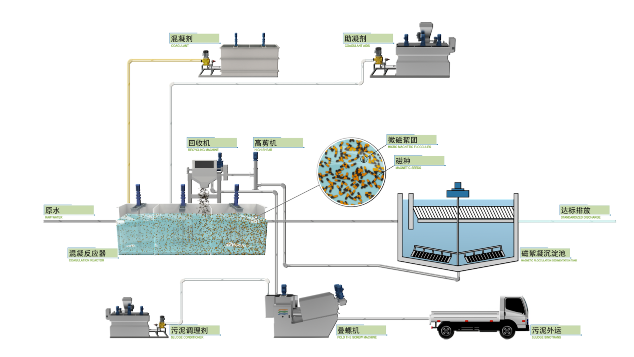 在綜合廢水處理工藝段,采用了我司的MagSep磁沉淀凈化設備,通過磁種加載沉淀,可高效去除廢水中難降解的總磷(TP)及氟化物(F)等污染物。實測數據顯示:針對初始TP濃度25mg/L、F濃度10mg/L的高污染負荷廢水,經我司設備處理后,出水TP濃度穩(wěn)定≤0.5mg/L,F濃度≤1.0mg/L,完全滿足《城鎮(zhèn)污水處理廠污染物排放標準》(GB 18918-2002)一級A排放要求。