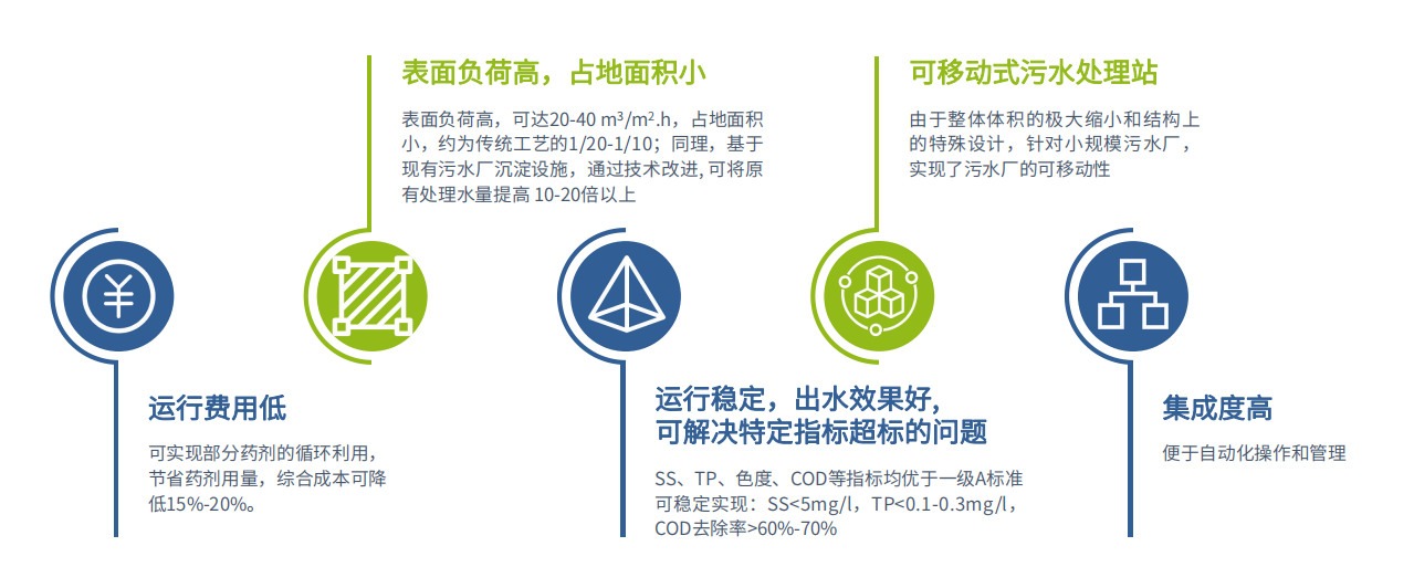 磁混凝沉淀一體化設備,主要工作原理是依據重介質加載沉淀原理,通過向污水中投加適量可循環利用的磁種,并使磁種均勻分散到水體中形成微小晶核,以此強化絮凝效果,并最終形成高密度絮凝體(磁種密度為水密度的5.1倍),依靠重力作用和斜管(板)沉淀原理實現固液的高速沉淀分離。同時輔以部分污泥回流系統以增強去除效果和降低藥劑費用。